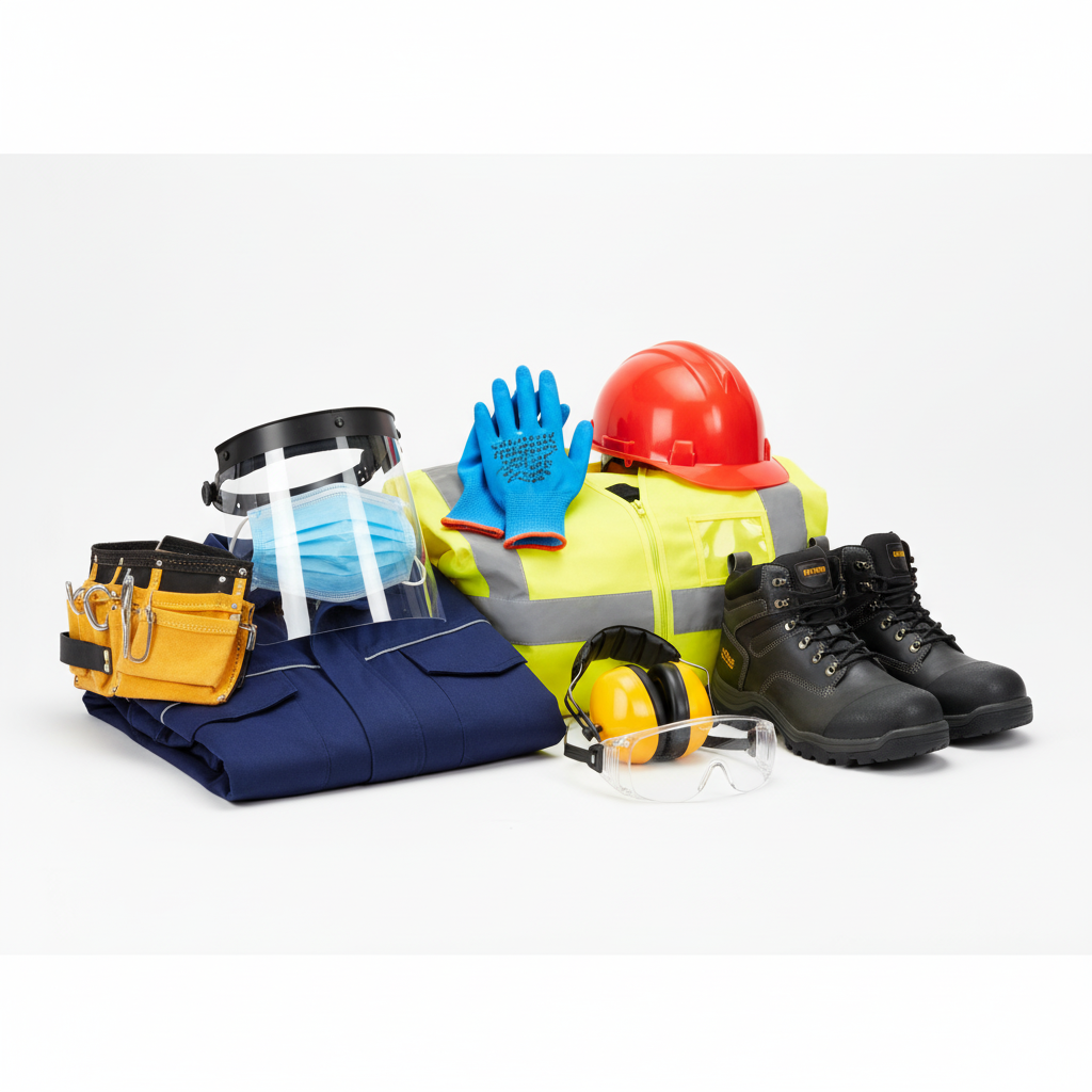 Dispositivi di protezione individuale (mascherine, visiere, guanti tecnici), indumenti da lavoro, e attrezzature professionali per manutenzione e sicurezza sul lavoro.