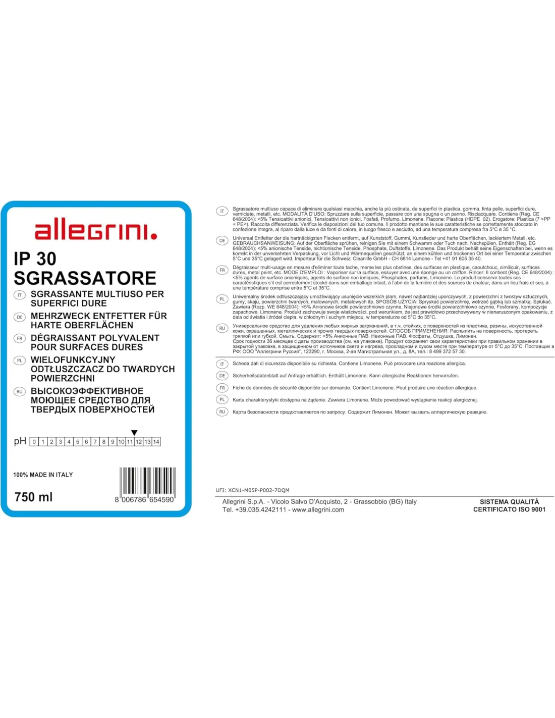 IP 30 SGRASSATORE - Detergente Liquido Schiuma Controllata per Macchie Ostinate 750ml - Allegrini